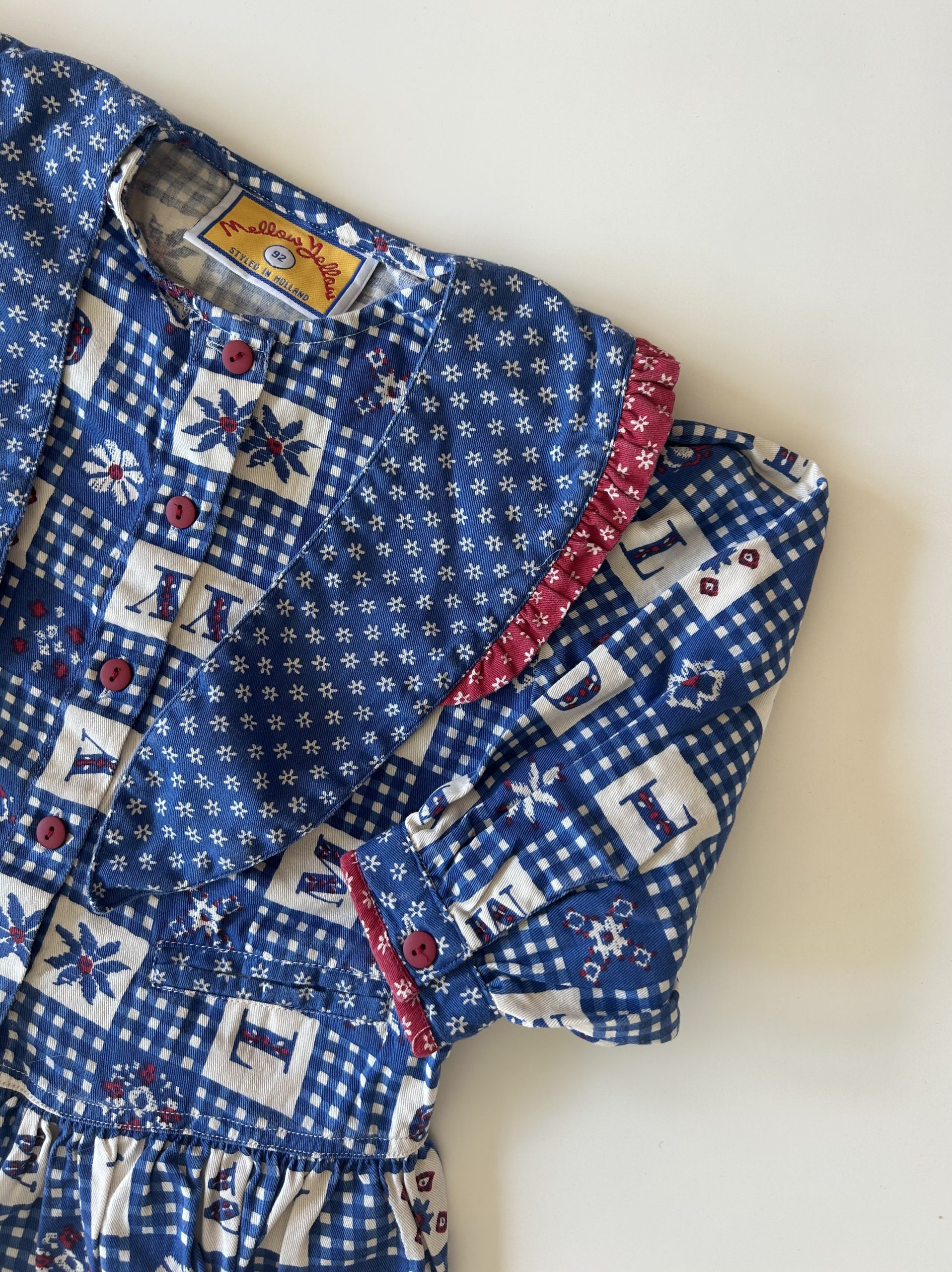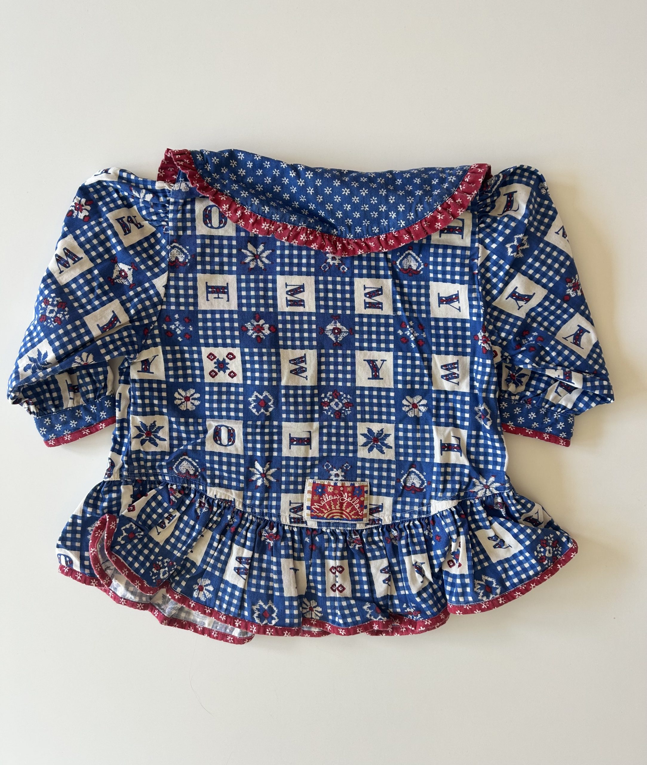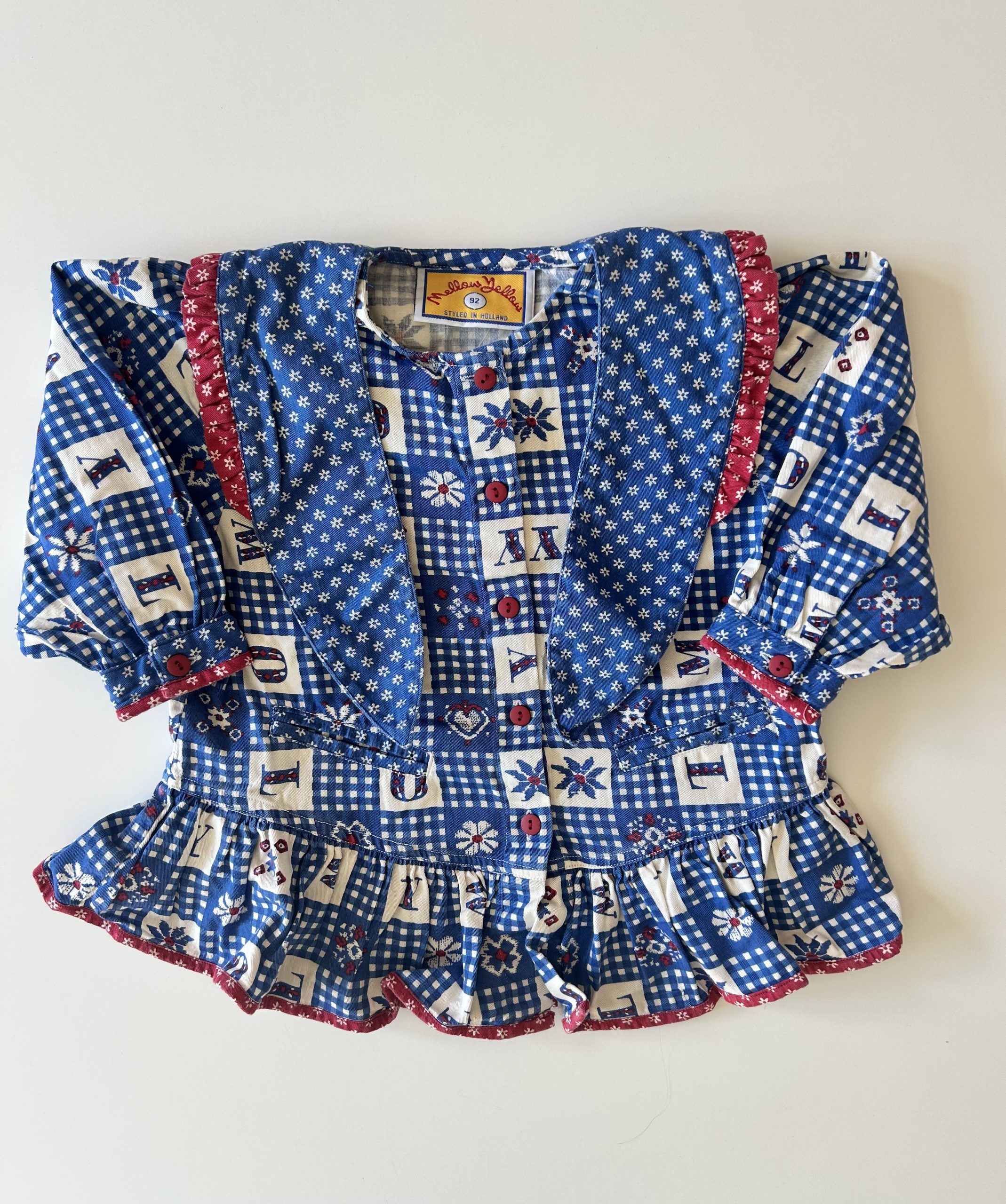 Deadstock blauw geblokte blouse met alfabet-letters en mooie details: brede kraag (die je kunt knopen), 2 steekzakken, rode knoopjes, ruches en embleem achterop. 100% katoen, stevige kwaliteit. Gewassen, kaartje er weer aangedaan en ready to wear. Maatlabel: 92 (2 jaar) Specs hieronder.