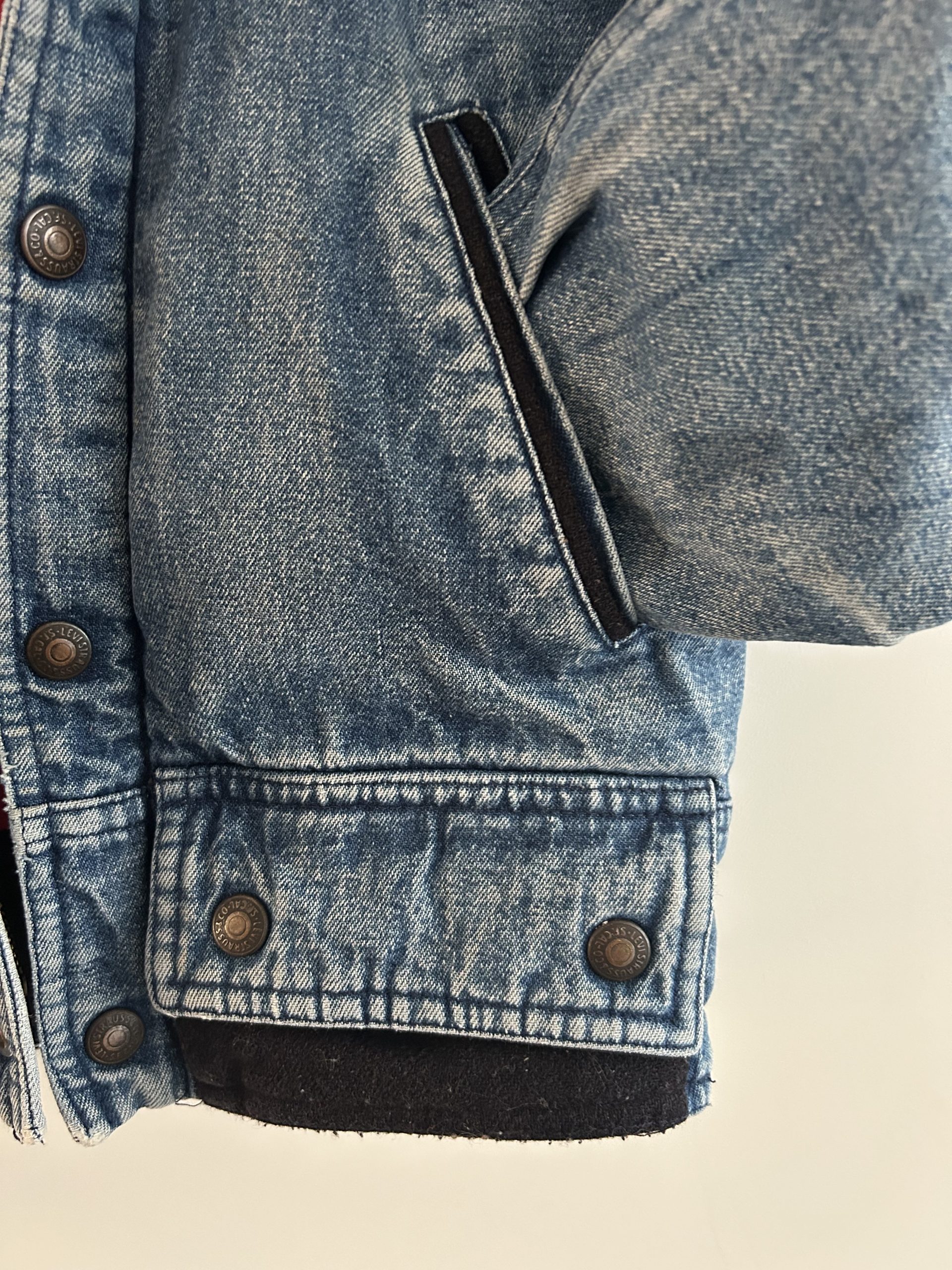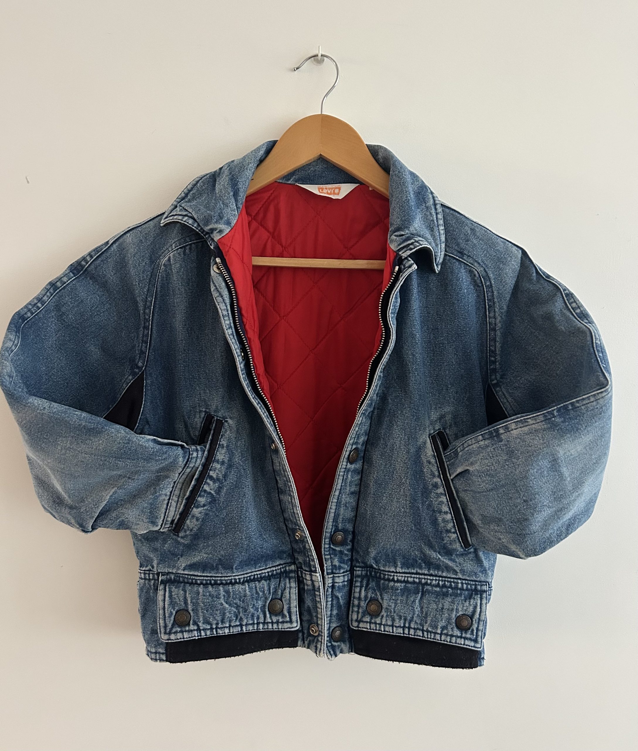 The coolest! Levis 80s denim bomberjacket. Helemaal gevoerd, leuke details en zowel rits als drukknopen. Gebruikssporen bij de mouwboorden. Europese productie. Maatlabel: 8 (valt klein, meer 5-6 jaar)