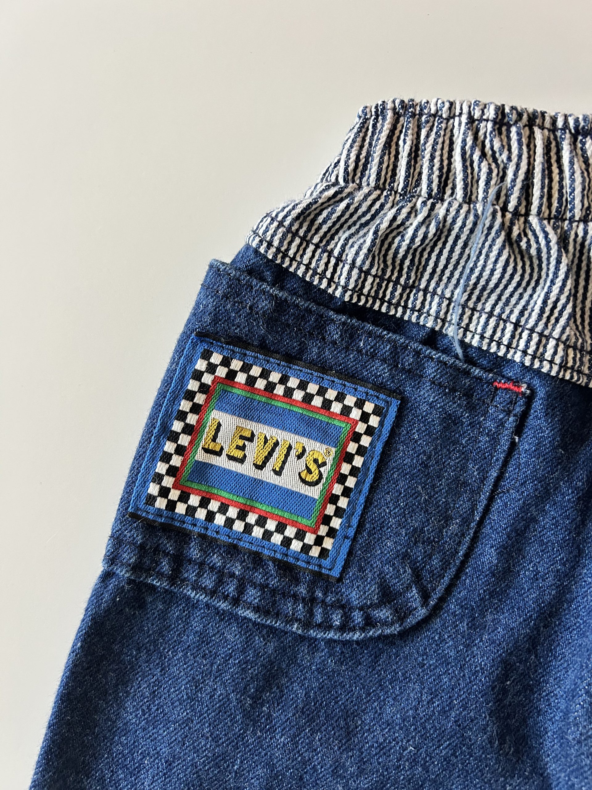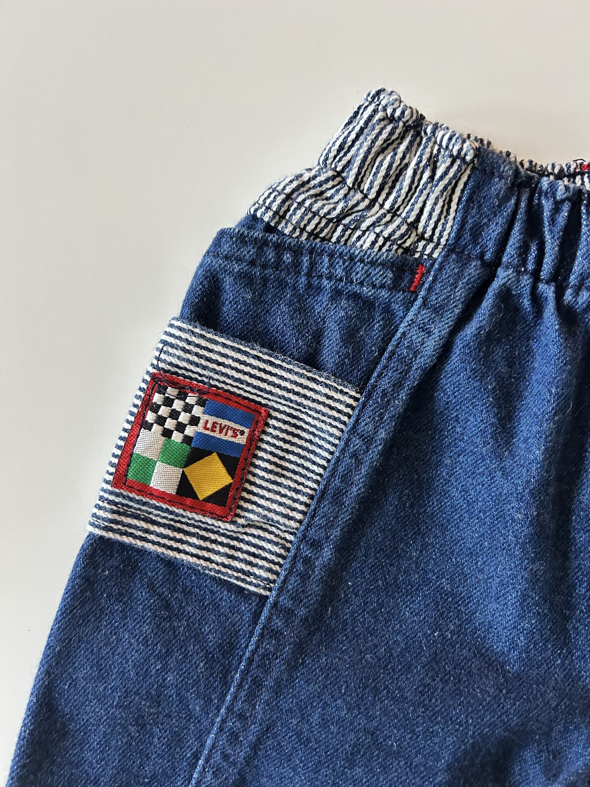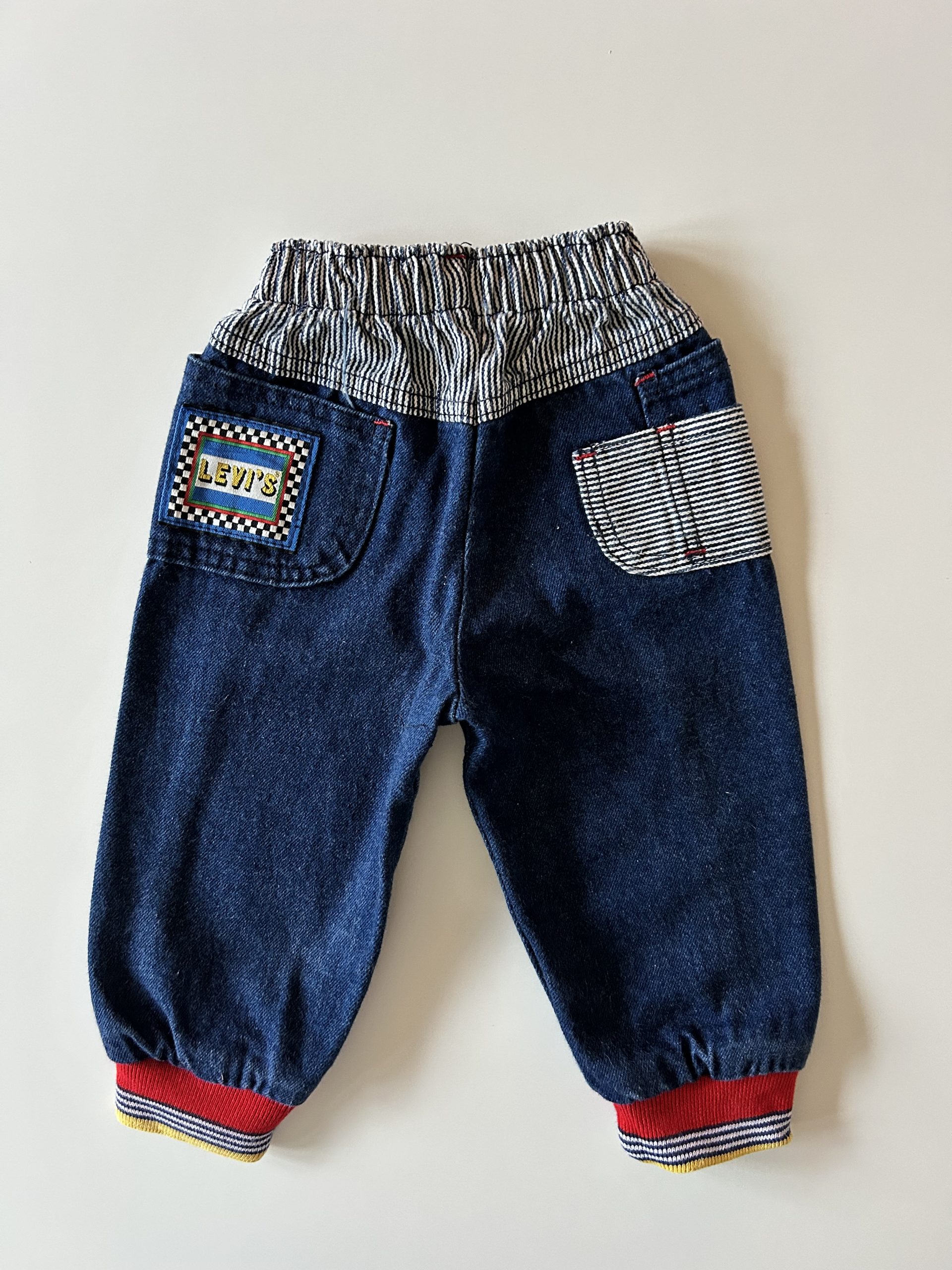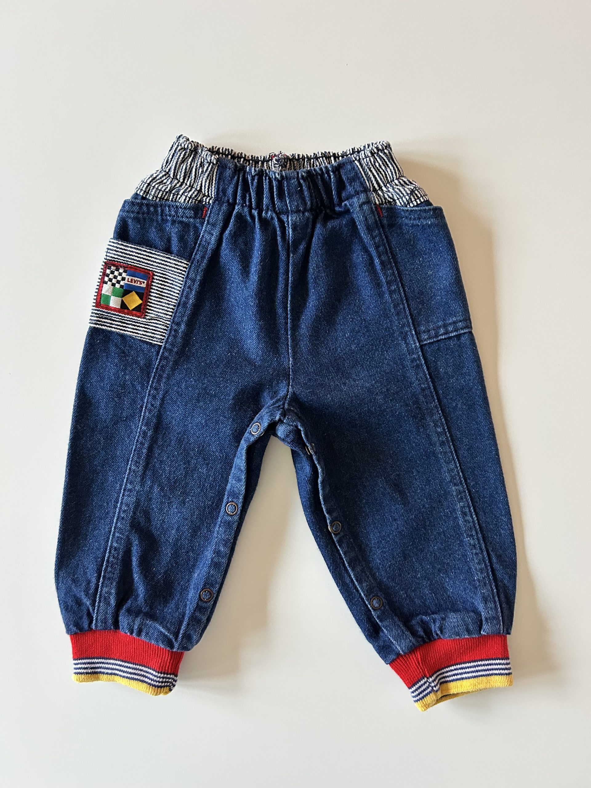 Oh myyyyyyy! Little Levis dark wash jeans met elastische taille, drukknopen, té gekke details en pofpijpjes. Hele stevige kwaliteit. Made in USA. Maatlabel: 18 mnd (valt kleiner)