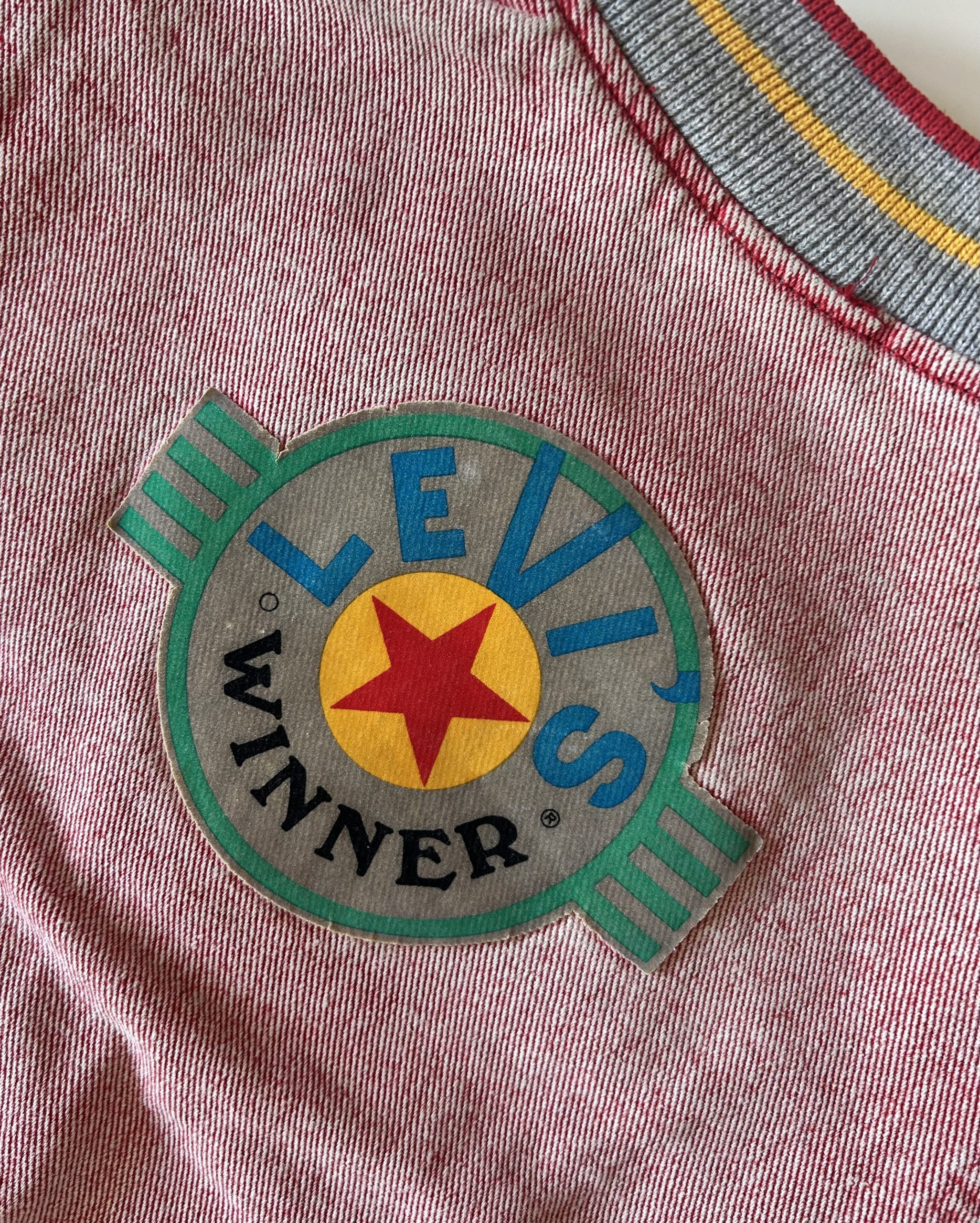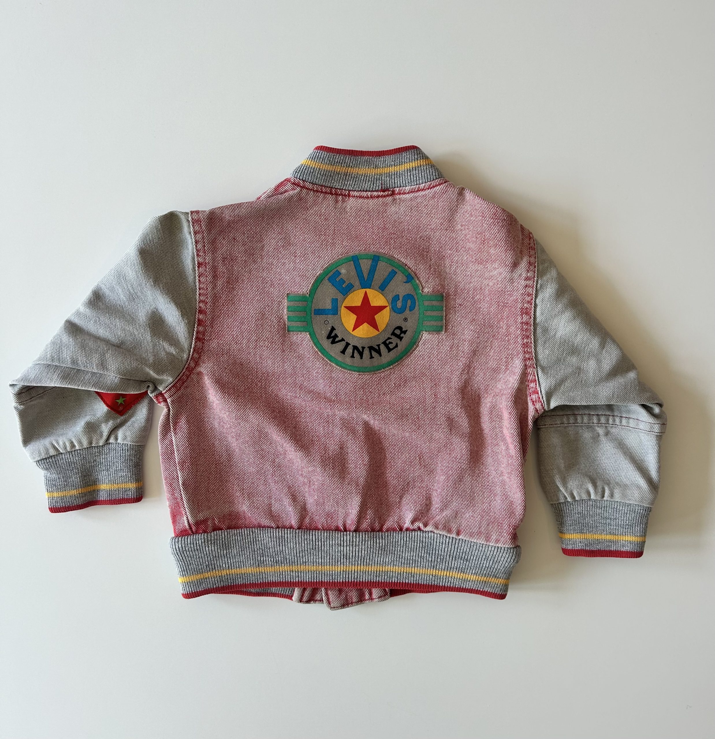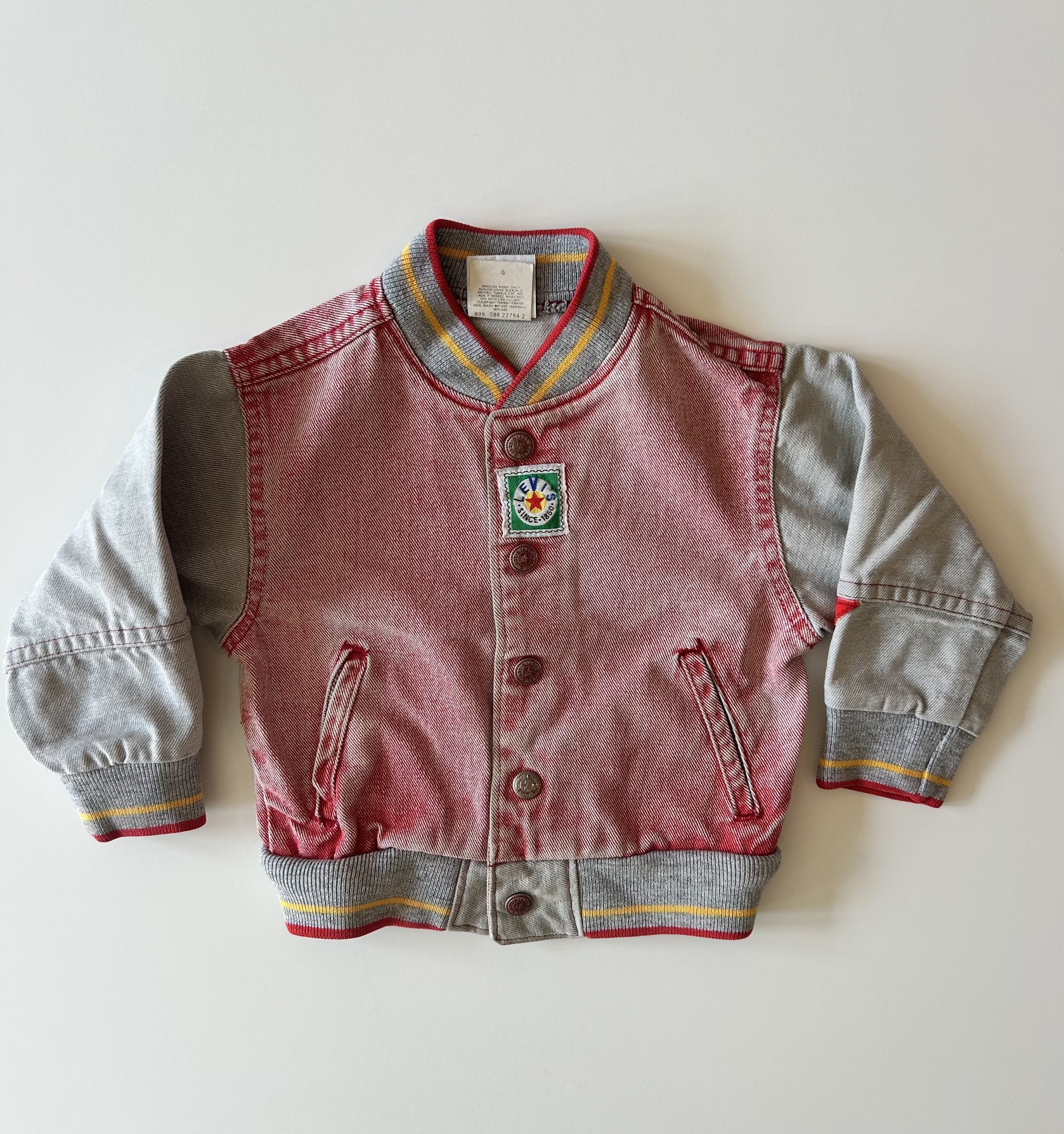 For the win! Levis 80s red faded denim jacket met drukknopen, 2 steekzakken en té gekke details. Made in USA. Maatlabel: 3 (valt klein, meer 1-2 jaar) Specs hieronder.
