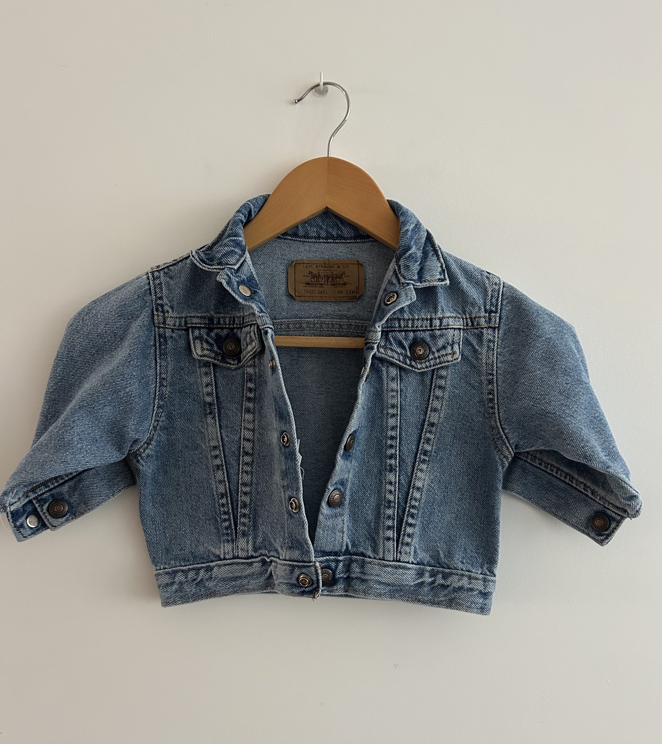 Little Levis 90s orange tab denim trucker jacket. Boxy fit. Made in USA uit 1992. Maatlabel: 18 mnd (1-2 jaar)