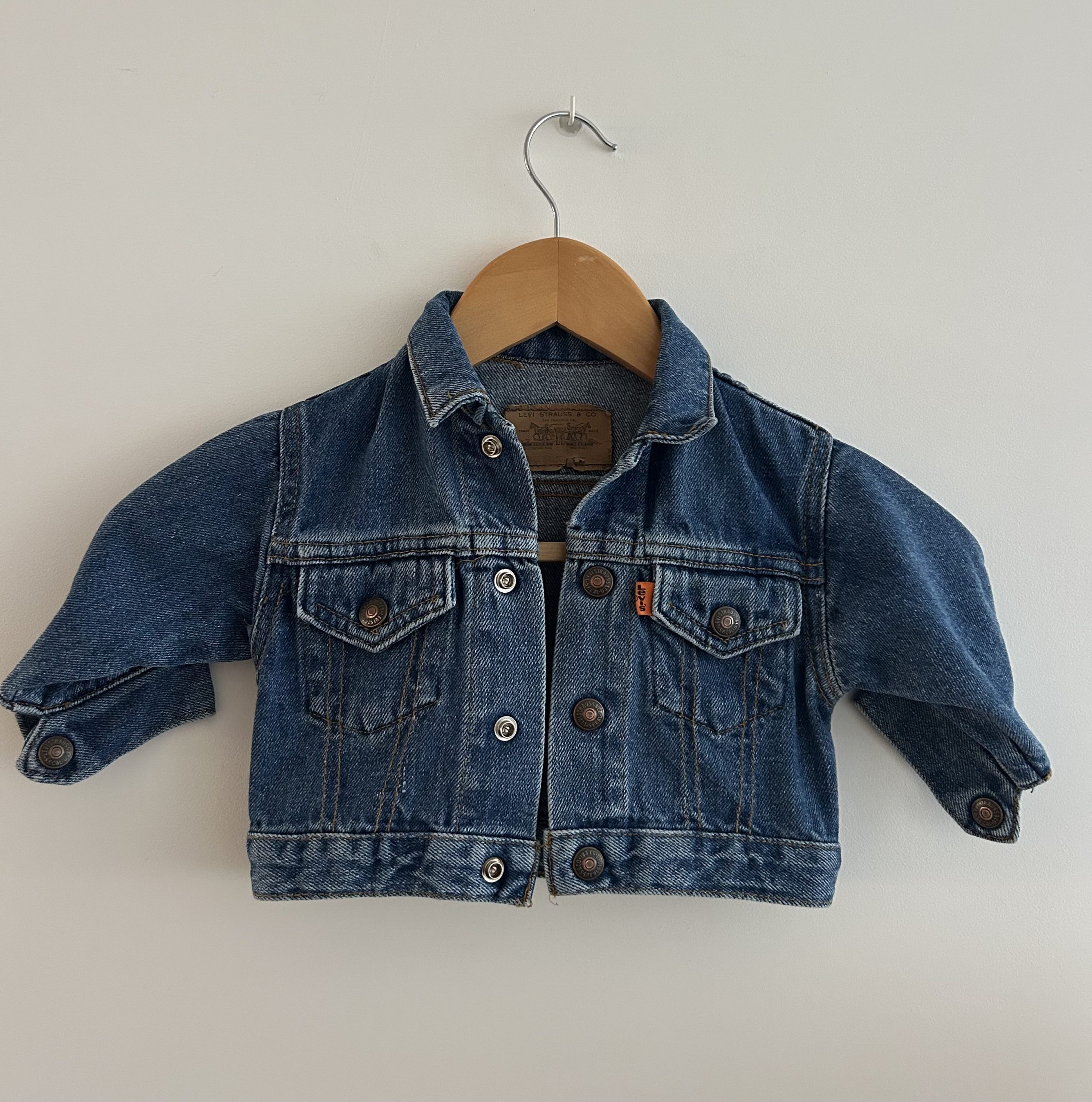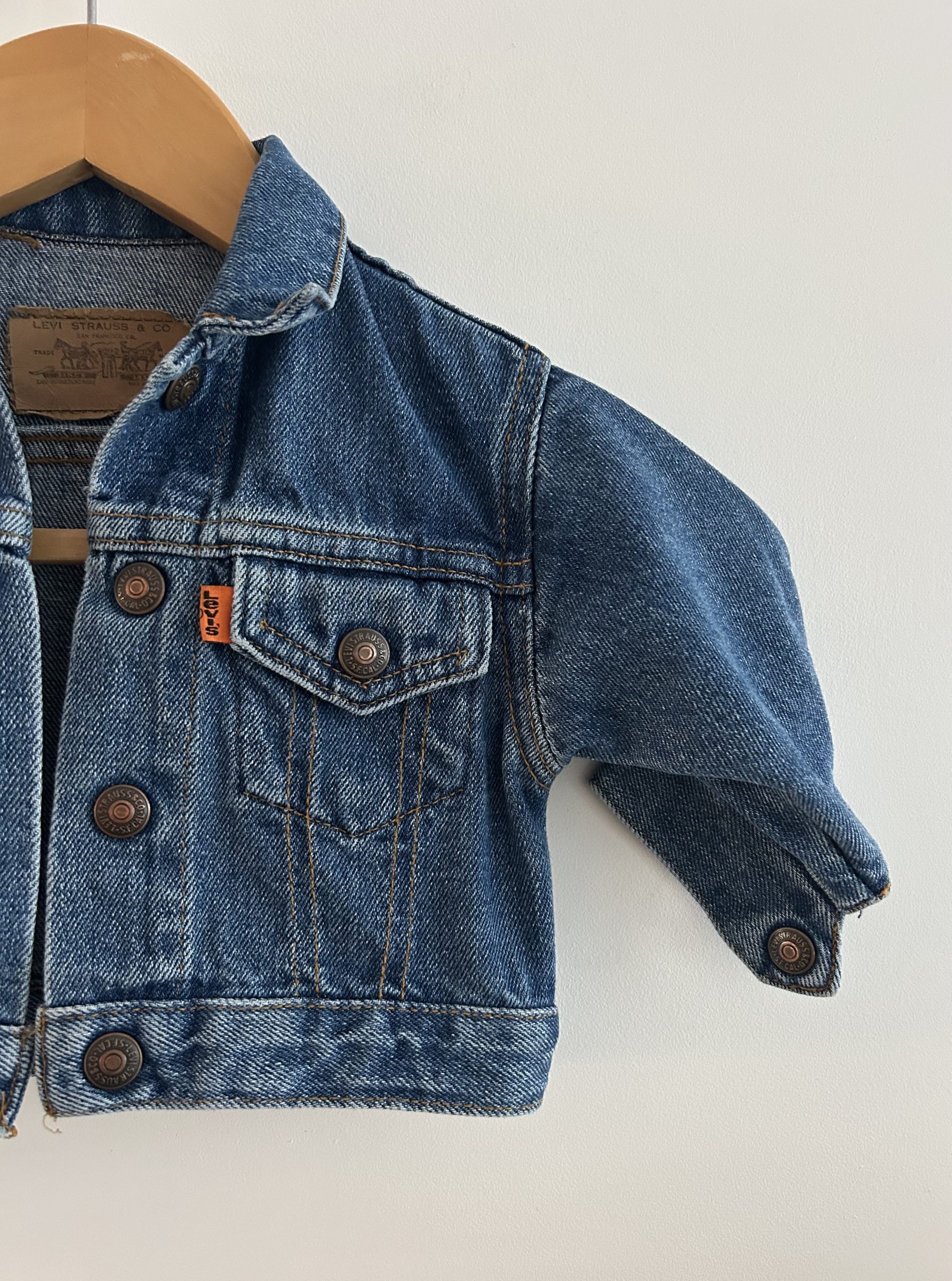 Little Levis 80s orange tab denim trucker jacket. Boxy fit. Made in USA uit 1988. Maatlabel: 9 mnd (kan eerder)