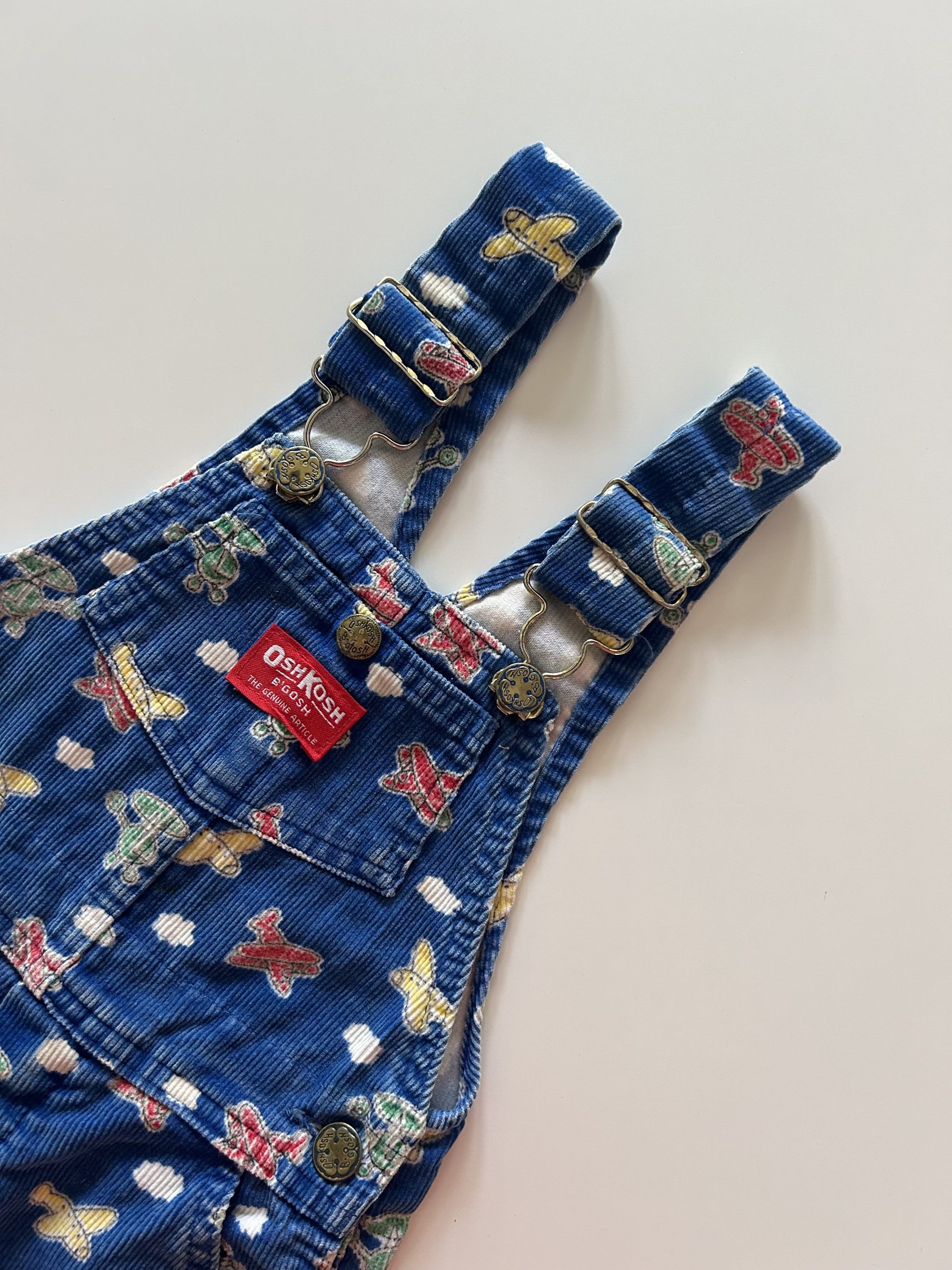 80s Oshkosh blue corduroy overall zonder drukknopen. Met vliegtuigjes en helikopters print! Beetje vaal op de knietjes, maar onverwoestbaar Made in USA. Maatlabel: 3T (2 jaar)
