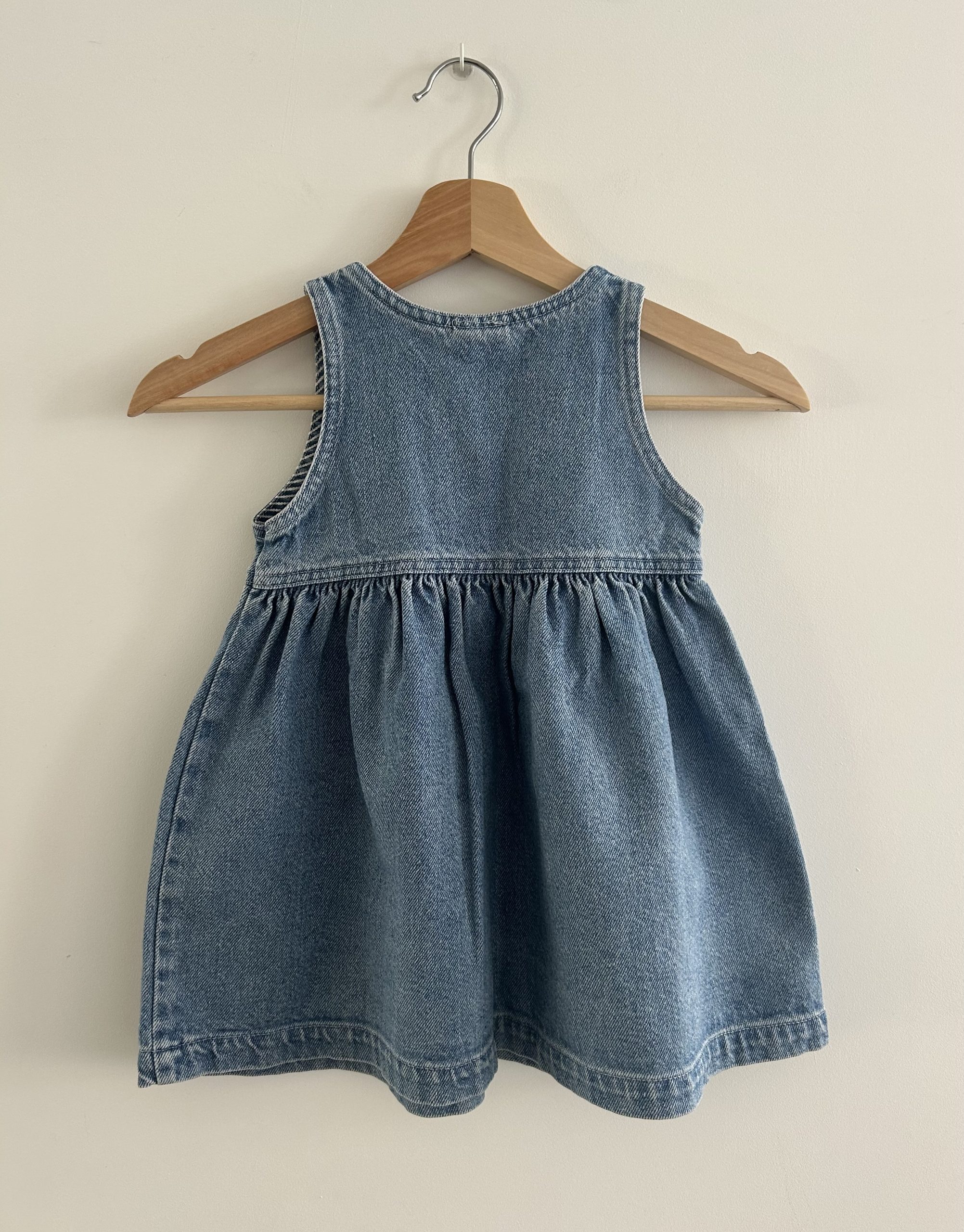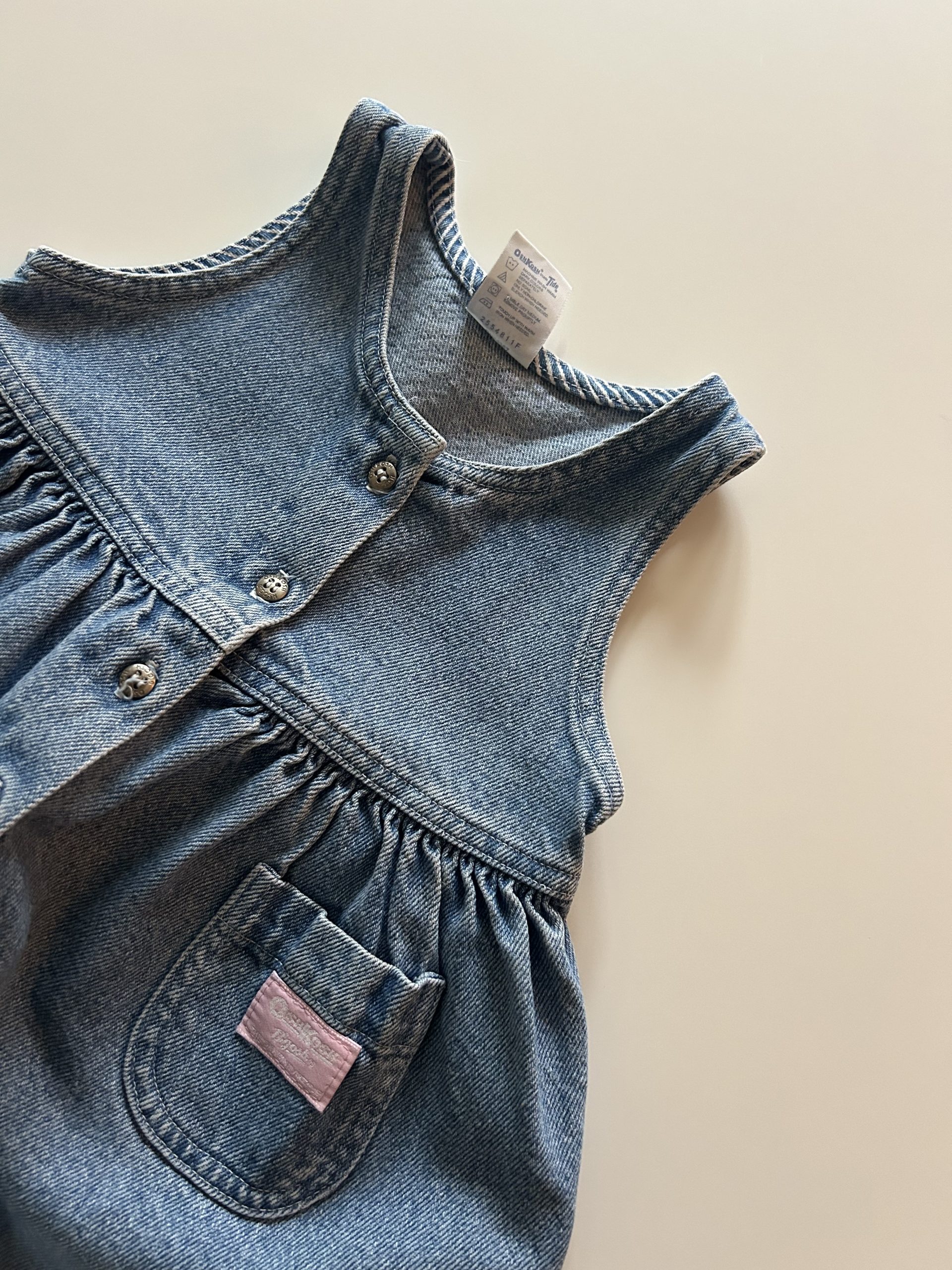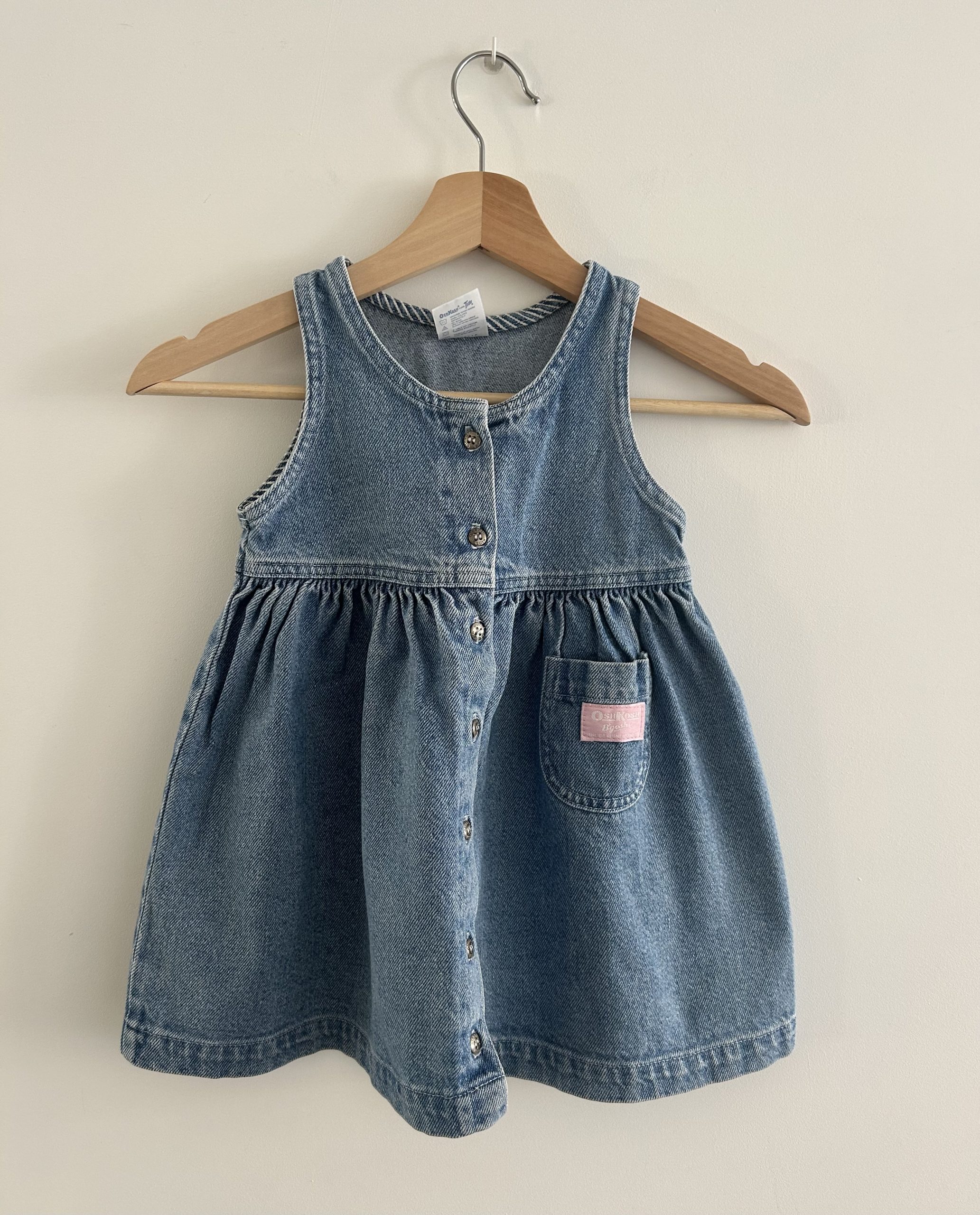 Beauty! Oshkosh denim dress met roze patch en in een medium wash. Hele mooie, stevige kwaliteit. Made in USA. Maatlabel: 3T (2 jaar)