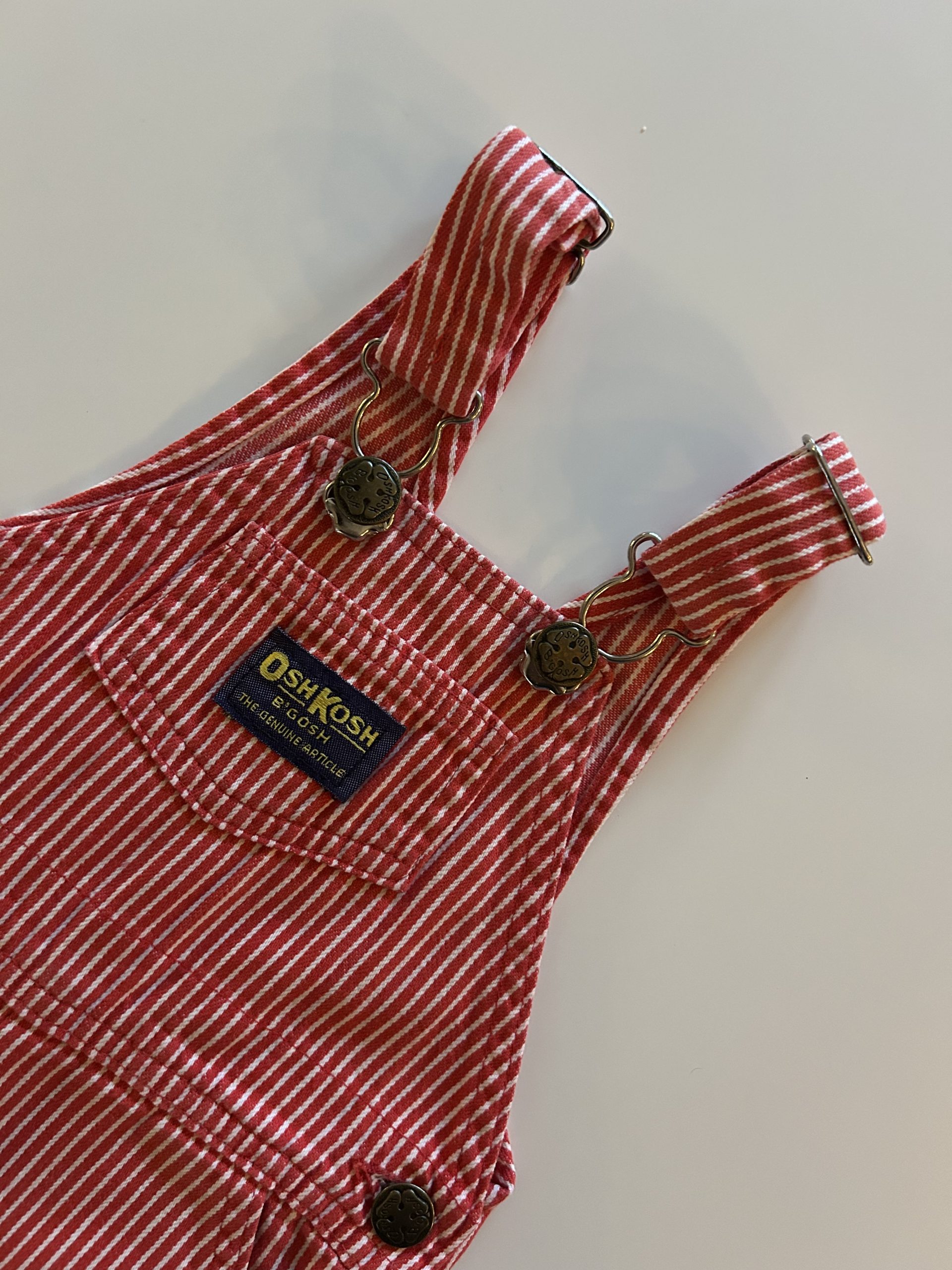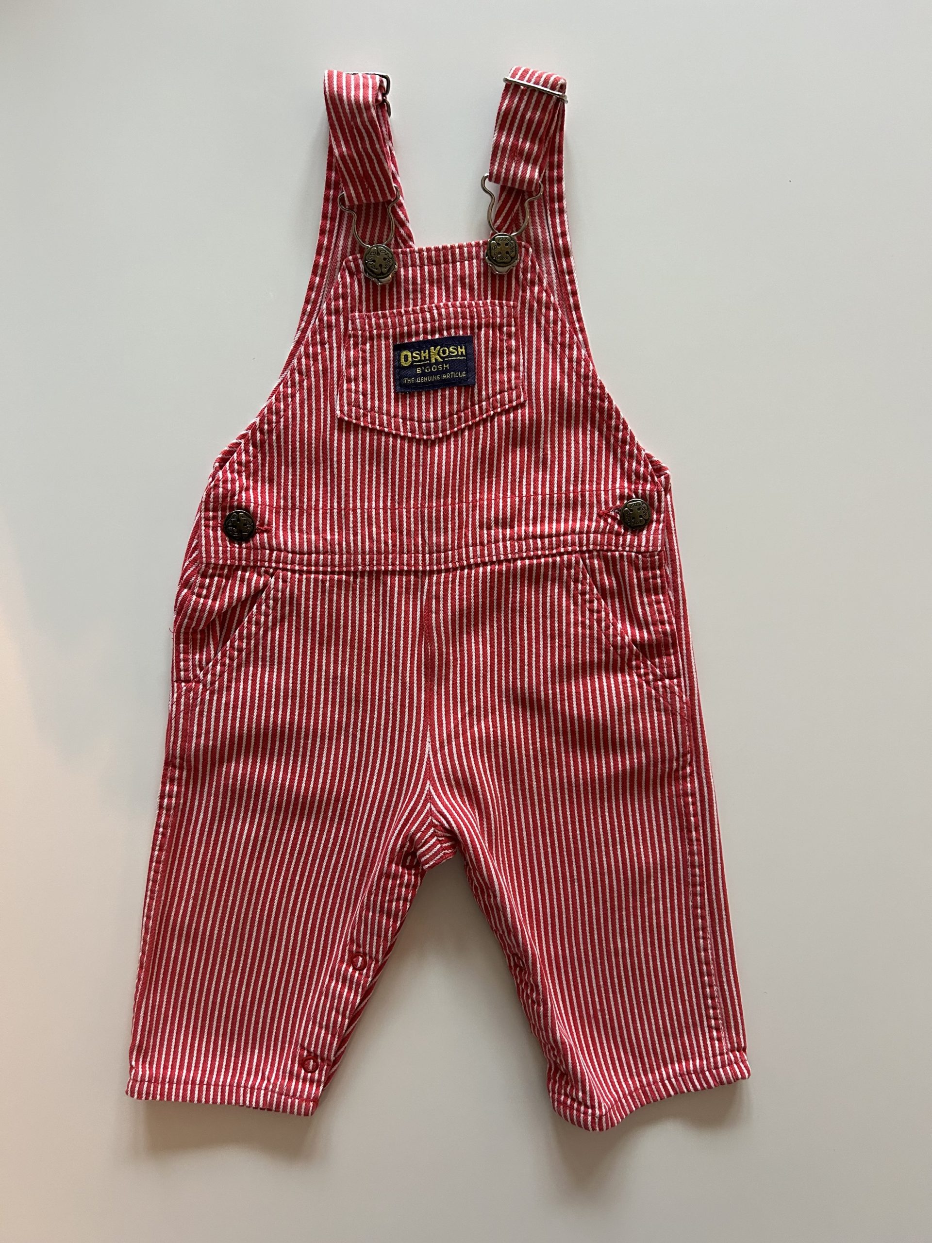 Oshkosh classic red striped overall met drukknopen voor het verschonen. Made in USA. Maatlabel: 12 mnd (valt klein)