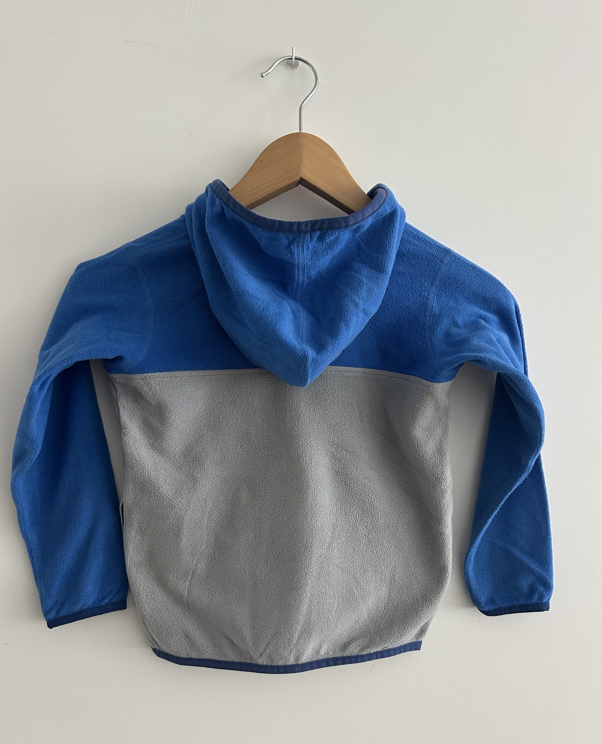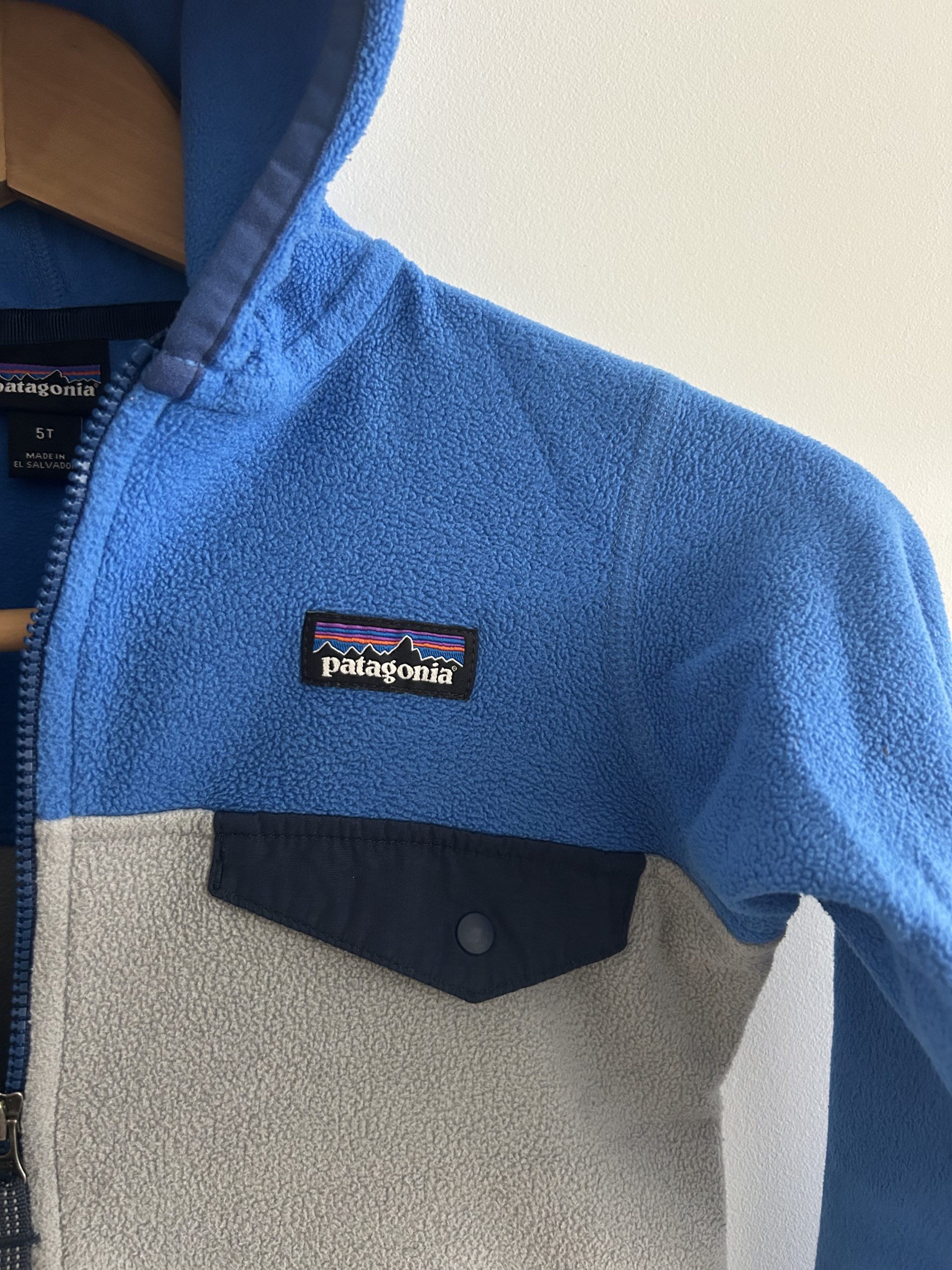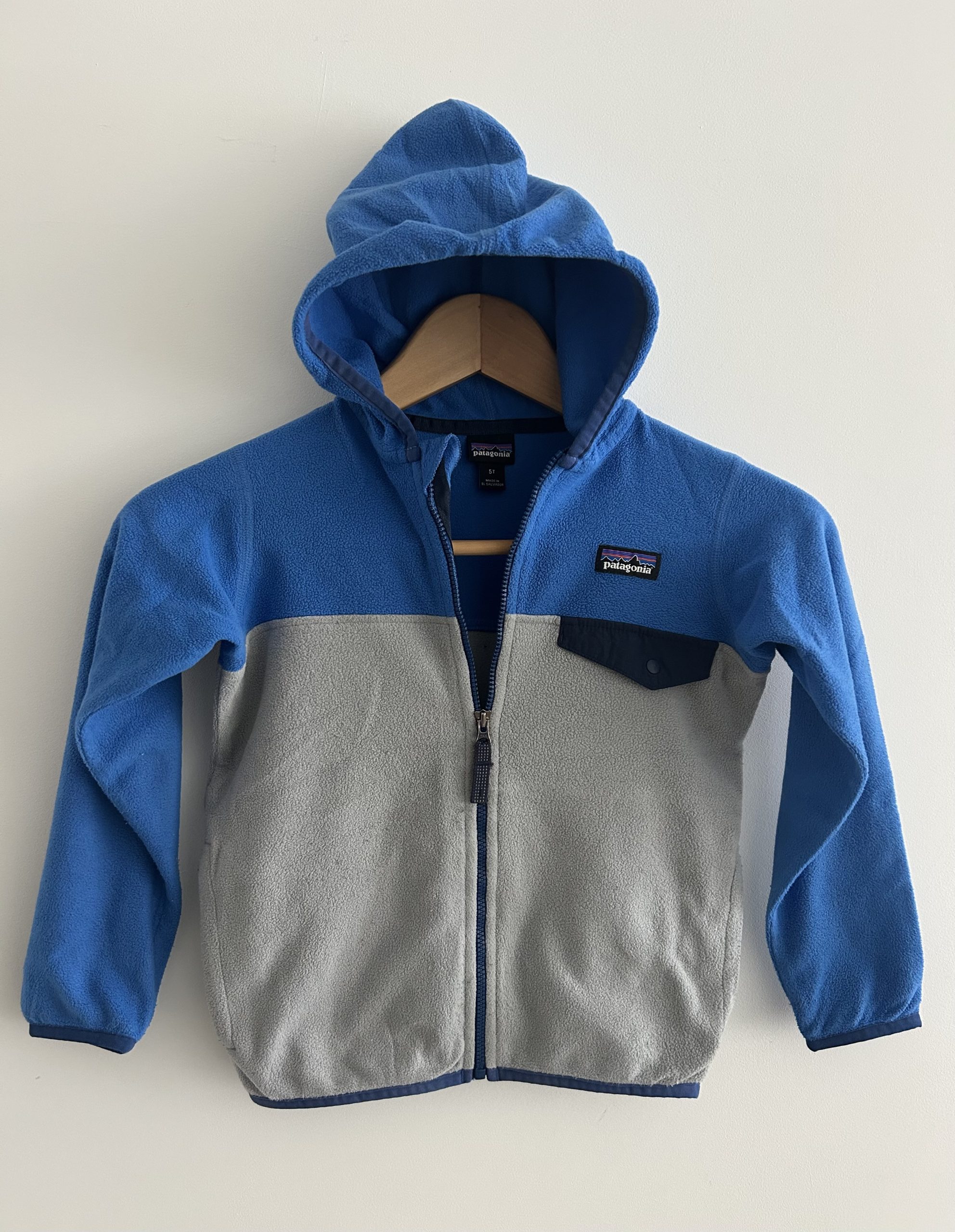 Patagonia Micro D® Snap-T® Fleece Jacket met capuchon, zipper en borstzak met klep. Gemaakt van 100% gerecycled polyester. Made in El Salvador. Maatlabel: 5T (4 jaar)