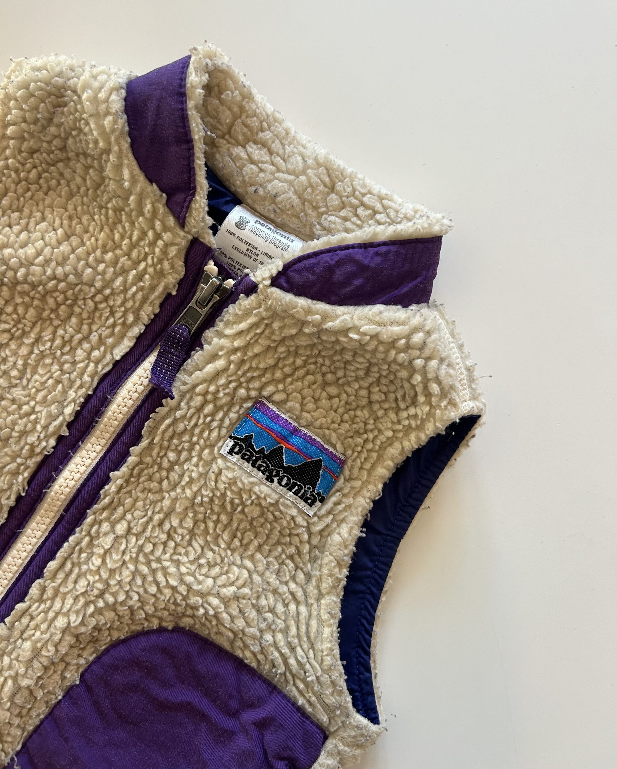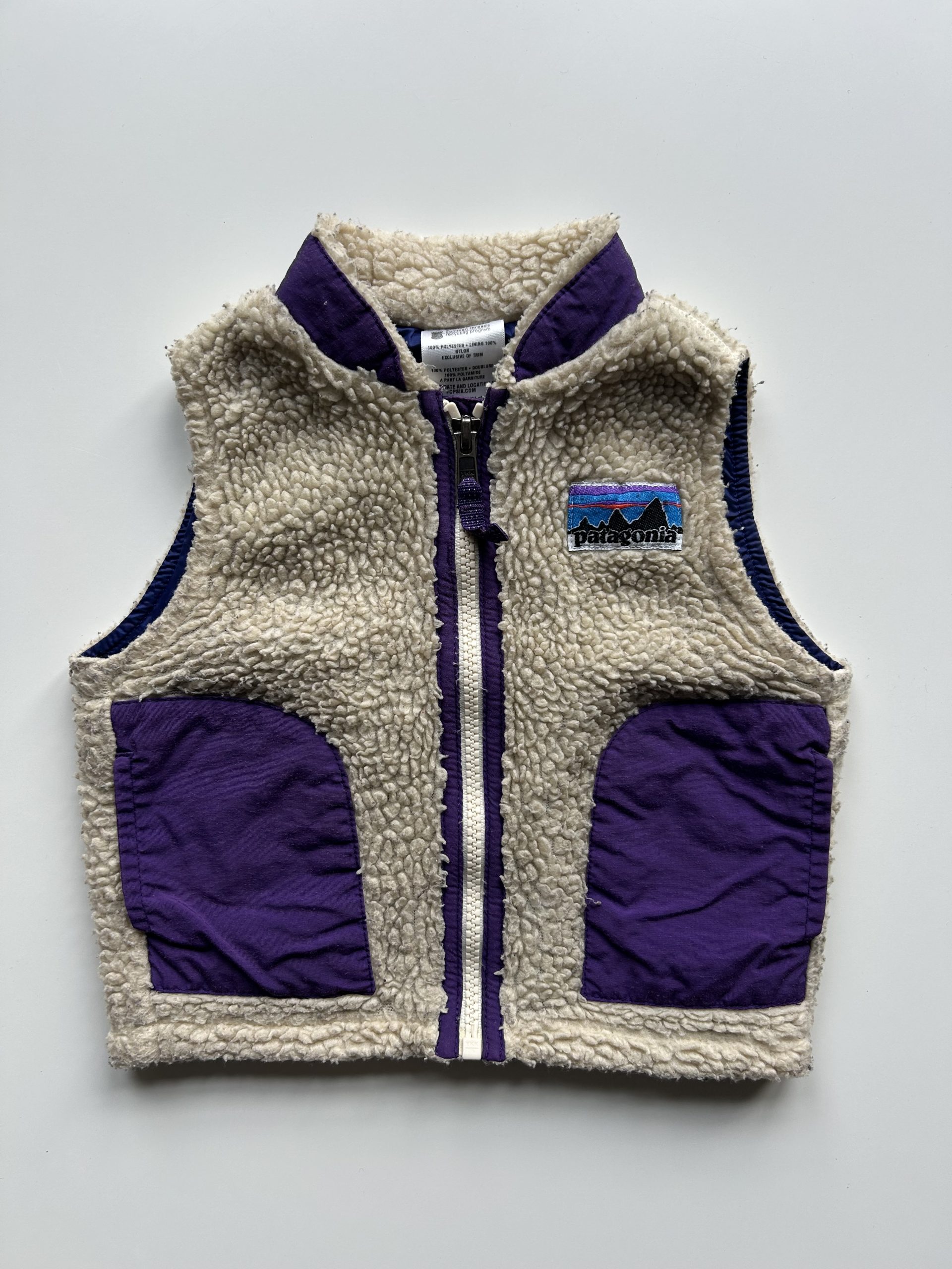Patagonia Retro-X purple/offwhite fleece vest met rits en 2 steekzakken. Heerlijk zacht en warm. Made in Costa Rica. Maatlabel: Baby 12 mnd